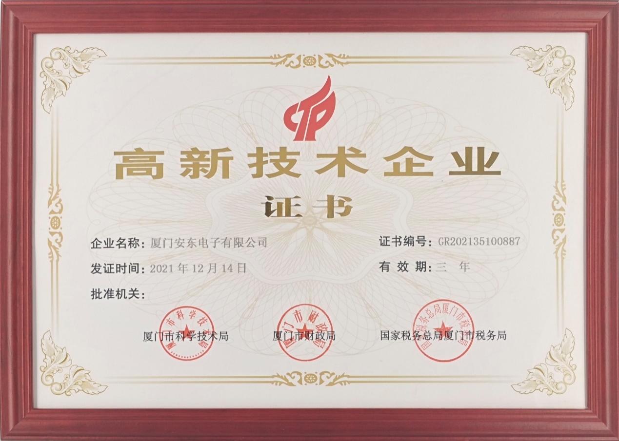 廈門安東電子連續(xù)16年榮獲廈門市高新技術(shù)企業(yè)稱號