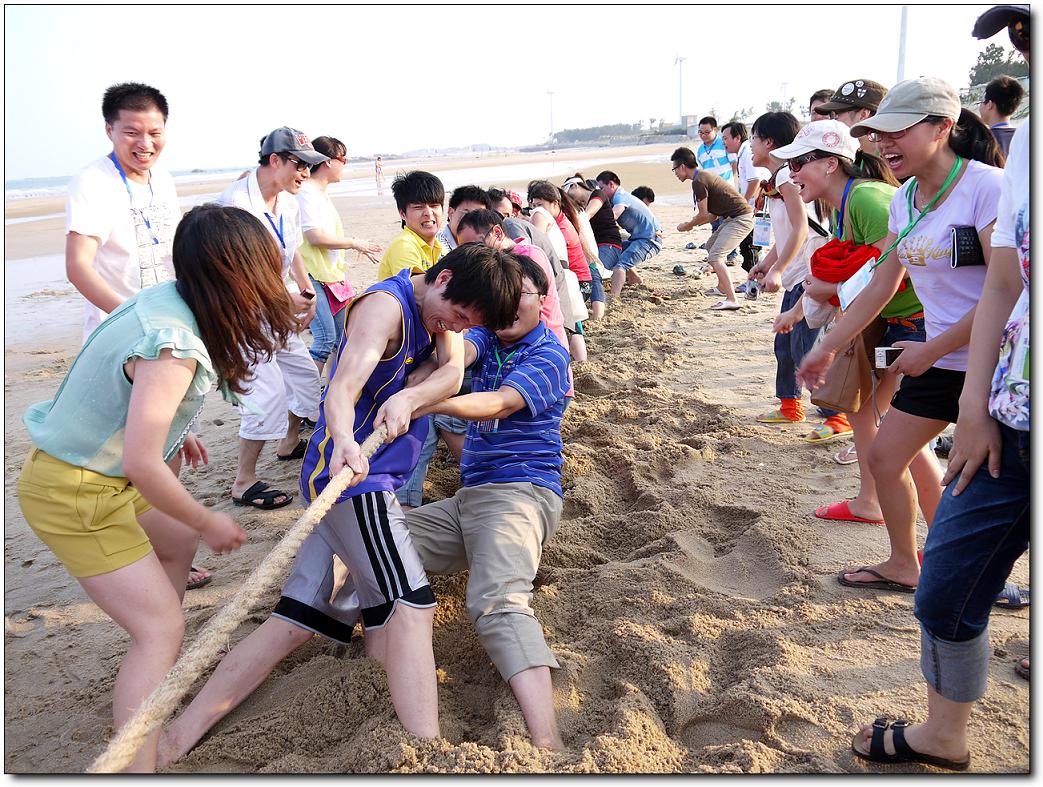 在30分鐘中之后,同事都把自己的帳篷搭好了。正是夕陽西下,海水一會兒波濤洶涌,一會又風平浪靜,復雜多變不但沒有影響同事們的游興,反而讓大家見識了與平時不般的海灘夜景,同事們有的一時迎風去浪,一時展臂潛游,不亦樂乎。幾分鐘過后,大家也都收拾好心情準備接下來的拔河比賽了。終于輪到我們組上場了,我們的對手是第三組。王經(jīng)理把參加比賽的隊員按照從高到矮的順序排好,隨著裁判的一聲令下,比賽開始了。只見隊員們雙手一前一后,緊緊地攥住繩子,雙腳分開,用力蹬著地,身體向后傾斜著,一邊有節(jié)奏地高喊“一、二!一、二!”,一邊共同用力拉繩子。我們組的拉拉隊員一邊大喊著“加油!加油!”,一邊用手勢指揮著隊員們用力。只見繩子一會兒被我們拉過來,一會兒又被對方拉過去,僵持下去。就在這關(guān)鍵時刻,我們趁著對方放松的一瞬間,一把奪過繩子,我們贏了,進決賽。在決賽我們面臨的強大的二組隊員,在前面我們都耗用了太多的體力,所以在決賽我們就一局輸贏。決賽開始了,隊員們心往一處想,勁往一處使,其他同事也不停地吶喊助威:加油!加油!隊員們憋足了勁,拼命地用力拉繩子。終于,在大家堅持不懈的努力下,我們贏了。比賽結(jié)束了,我們組拿到了第一名,我們集體合照,讓大家留下一個美好的回憶。同事們都覺得這次活動很有趣。大家紛紛表態(tài):今后要好好鍛煉身體,下次再有這樣的活動,我們一定要爭取得冠軍!