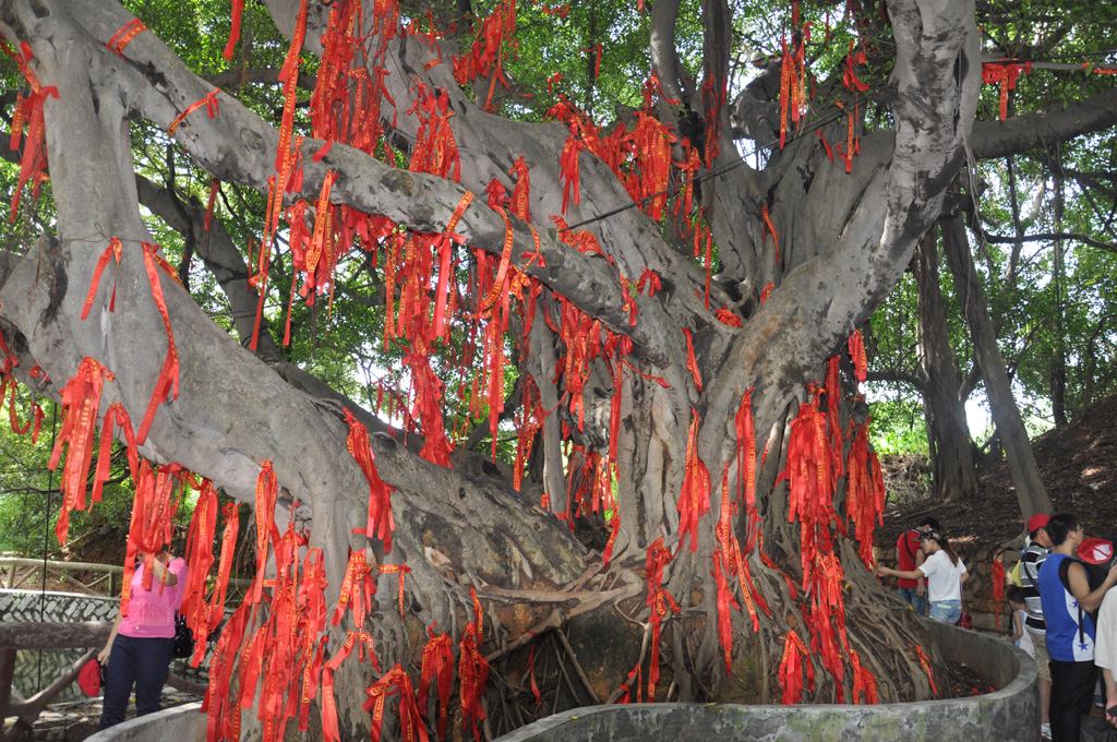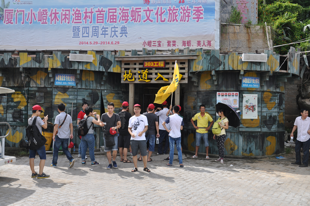 迫不及待的想登上游船前往小嶝島,一覽這距離金門只有1600余米的島嶼。為了防止人員走散或發(fā)生安全問題,旅行社為每一個(gè)人都準(zhǔn)備了一頂設(shè)計(jì)獨(dú)特的旅游帽,我們戴上它,分成幾個(gè)小組正式開始旅游。首先,參觀的是小嶝島地底下的縱橫交錯(cuò)的坑道,一千多米長的秘密坑道橫貫小嶝全島,要想獲得現(xiàn)在如此的平靜與安詳是多么的不容易。接著在導(dǎo)游的陪同下,我們一行來到了英靈殿,參觀了有著六百多年樹齡的“八閩鐵樹王”, 樹干上分出了三支粗大的分枝,彎彎曲曲伸向不同方向,似龍又似鳳,大家認(rèn)真的聽著導(dǎo)游講解著其中的故事。據(jù)說這顆鐵樹每年都開花,吉祥的寓意給當(dāng)?shù)鼐用駧チ讼楹团c寄托,為了留住這美好的瞬間,有人舉起相機(jī)捕捉了這個(gè)最美好的風(fēng)景。